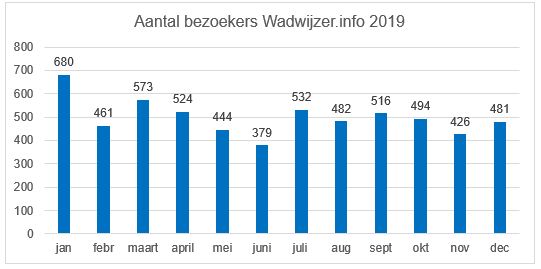 De bezoekcijfers van website wadwijzer.info laten een toename zien ten opzichte van het voorgaande jaar. In 2019 werd de website 5992 keer bezocht. Dit is een stijging ten opzichte van 2018 (5124) van 17%. In de onderstaande tabel worden de bezoekerscijfers over 2019 per maand weergegeven.