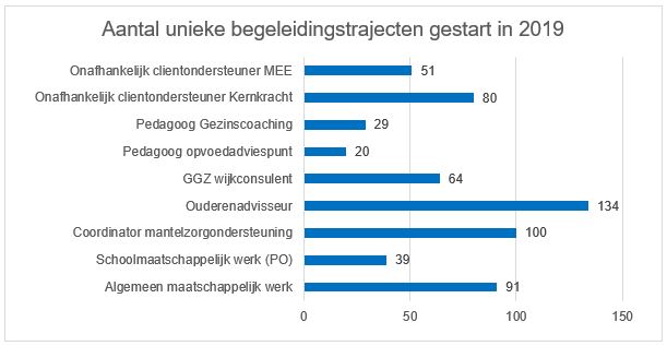 In totaal zijn er in Waddinxveen vanuit Wadwijzer in 2019 608 begeleidingstrajecten aangeboden. De manier waarop de begeleiding plaatsvindt, de frequentie en ook de duur verschilt, afhankelijk van de discipline, de vraag en de doelgroep die wordt bediend. Hierdoor zijn de aantallen per discipline lastig met elkaar te vergelijken. De cijfers van Jeugdondersteuning Op School (JOS) waren onvolledig en zijn niet opgenomen. De cijfers van MEE (51) bevatten ook trajecten van diagnostisch onderzoek.