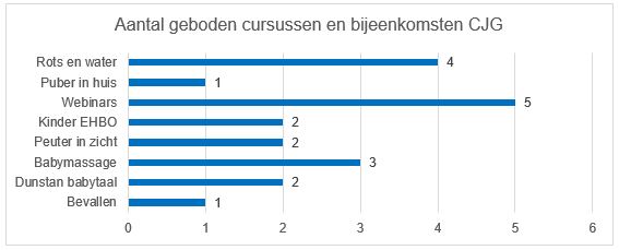 In 2019 zijn er vanuit het CJG 20 cursussen gegeven. Totaal namen er 129 personen aan deel. Dat zijn er 41 meer dan in 2018 en leidt tot een stijging van 46,5%.