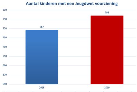 Ook het aantal kinderen met een Jeugdwet voorziening is toegenomen in 2019. De totale stijging betreft ca. 4%. In deze aantallen zitten ook de kinderen met een PGB-voorziening, of een voorziening waarbinnen in 2019 geen zorg geleverd en/of gedeclareerd is.