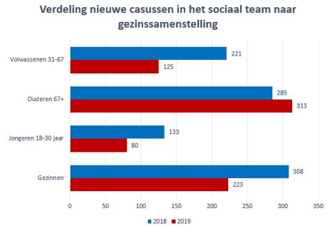 Hieronder worden het aantal nieuwe casussen van het sociaal team weergegeven naar samenstelling van het gezin. Op deze wijze worden ook de casussen van het sociaal team onderverdeeld, d.w.z. naar de leeftijd en gezinssamenstelling van het gezin. Er wordt hiermee meer integraal en vanuit de hulpvraag van een inwoner gekeken en minder vanuit de wettelijke grondslag van een eventuele voorziening. Daarbij geldt verder het volgende:
