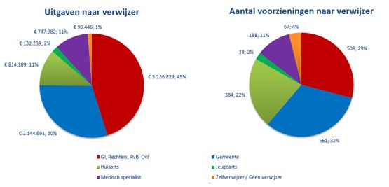 Dit beeld is overwegend hetzelfde gebleven als in de vorige monitor rapportages. Dit betekent dat het (relatieve) aandeel van de gemeente zich nog beperkt heeft tot ongeveer 30% van de uitgaven en het aantal verwijzingen. De gecertificeerde instellingen, rechters, raad voor de kinderbescherming en de officier van justitie vormen tezamen de grootste verwijzers groep als het gaat om de uitgaven. Het aandeel van de huisartsen is beperkt tot 11%, maar de achterliggende verwijzingen voor de ZIN-voorzieningen zijn wel voor 22% tot de huisartsen te herleiden.