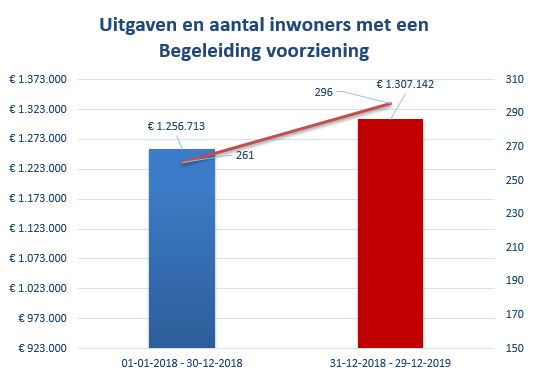 In het volgende figuur ziet u het totaal aan inwoners met een voorziening voor begeleiding afgezet tegenover de uitgaven. U ziet een stijging van het aantal inwoners met een begeleidingsvoorziening. Ook ziet u een stijging van de uitgaven.