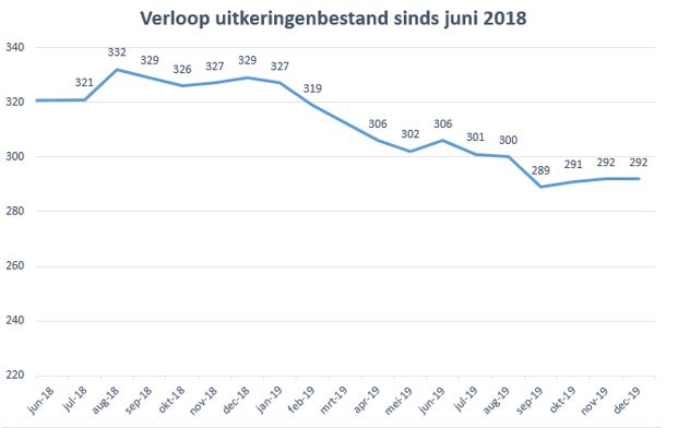 In de grafiek hieronder ziet u het verloop van het bestand van uitkeringsgerechtigden sinds juni 2018. Er is een stevige daling ingezet vanaf augustus 2018, maar de gewenste halvering is niet in zicht. Het grootste deel van de instroom is veroorzaakt door de beëindiging van WW of ziektewetuitkeringen, door de huisvesting van statushouders en door verhuizingen naar Waddinxveen van nieuwe inwoners die reeds een bijstandsuitkering hadden. De uitstroom is voor ruim de helft van de gevallen veroorzaakt doordat deze inwoners een baan hebben gevonden of een ander inkomen in een zelfstandig beroep of bedrijf hebben verkregen. Dit beeld is vergelijkbaar met afgelopen jaren en de vorige monitorrapportages.