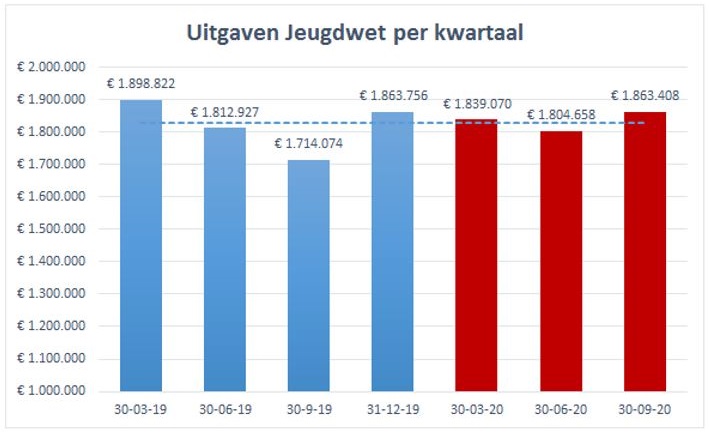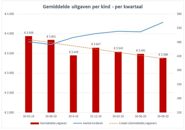 We zien dat de gemiddelde uitgaven per kind in het derde en vierde kwartaal van 2019 lager lagen dan in het eerste halfjaar, en dat de gemiddelde uitgaven in het eerste en tweede kwartaal van 2020 nogmaals lager lagen. Naar verwachting zien wij deels of eerder een effect van de coronacrisis. De definitieve jaarcijfers zullen een scherper beeld laten zien.
