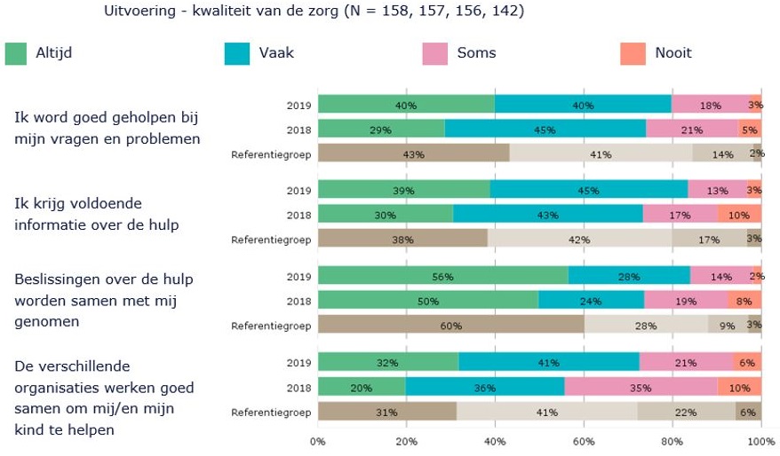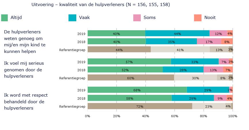 Tot slot is gevraagd of jongeren en ouders zich met respect behandeld voelen door de hulpverleners. 97% van de respondenten voelt zich vaak of altijd met respect behandeld door de hulpverleners. In 2018 lag het percentage dat zich met respect bejegend voelde nog lager: 87%.