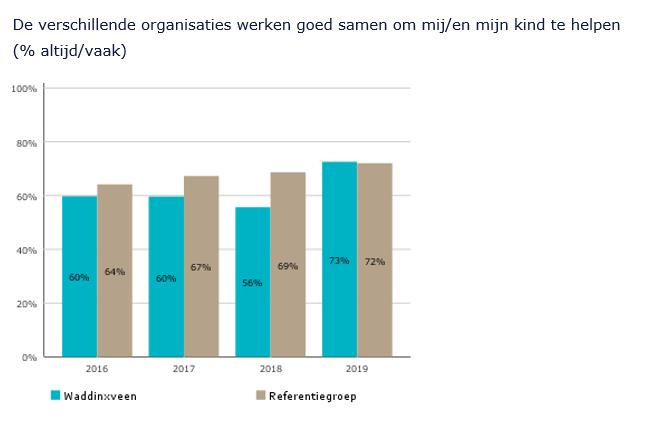 Indien er verschillende organisaties betrokken zijn bij de hulp voor een jongere of een kind is het van belang dat zij samenwerken om hem of haar goed te kunnen helpen. 83% van de respondenten die van verschillende organisaties hulp ontvangen, ervaart dat deze goed samenwerken om hem of haar te helpen. 27% ervaart dat soms of niet. In 2018 lag het percentage dat vond dat er goed werd samengewerkt nog significant lager: 56%.