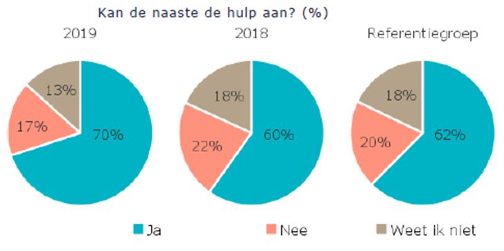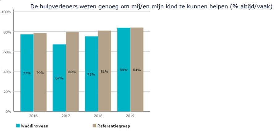 84% van de respondenten vindt dat de hulpverleners vaak of altijd genoeg kennis hebben om hen te kunnen helpen. 16% vindt dat niet of soms. In 2018 lag het percentage dat vond dat de hulpverleners vaak of altijd genoeg kennis hebben om hen te kunnen helpen nog een stuk lager: 75%. In 2017 lag dit percentage zelfs slechts op 67%.