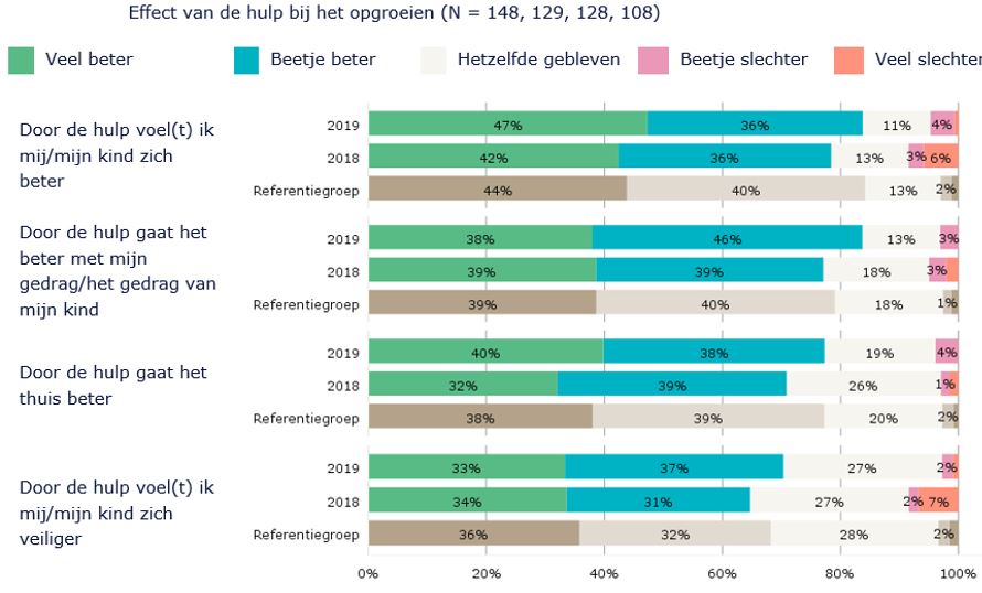 Het door respondenten meest ervaren effect van de hulp bij het opgroeien is dat het hierdoor beter gaat met het gedrag van het kind: 84% ervaart dit effect. Een positief effect op hoe het kind zich voelt, wordt ook door veel respondenten ervaren (83%).