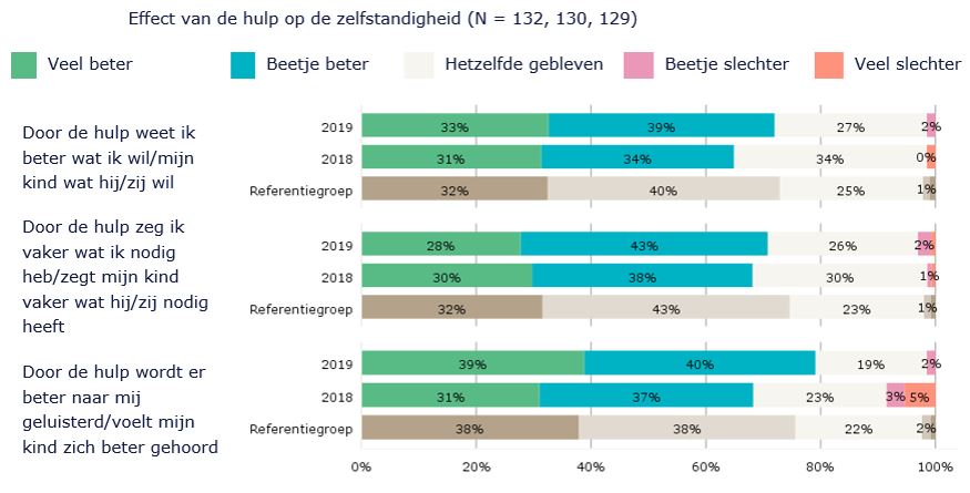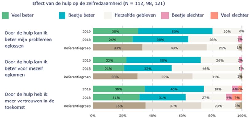 Ten opzichte van voorgaande metingen worden de ervaren effecten van de hulp op de zelfstandigheid positiever ingeschat. Dit gaat met name op voor de mate waarin men zich gehoord voelt.