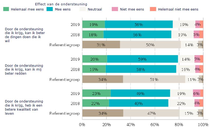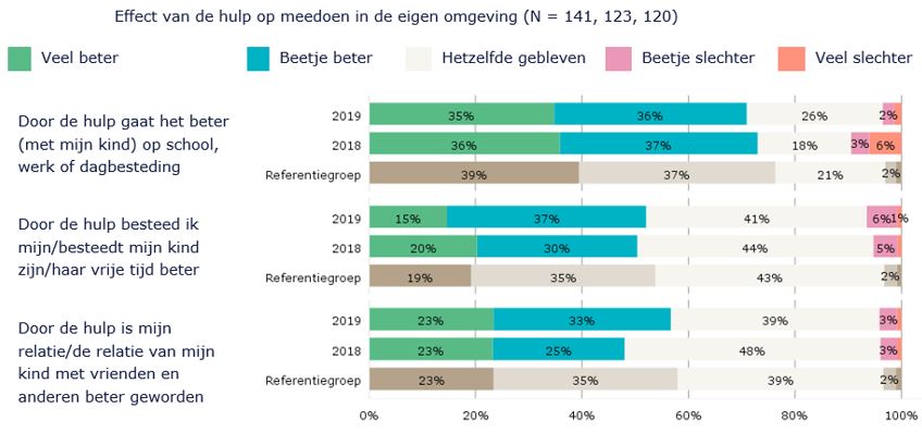 Ten opzichte van de vorige meting worden de positieve effecten van de hulp op het meedoen in de eigen omgeving in ongeveer gelijke mate ervaren (soms iets sterker, soms iets minder sterk). Een uitzondering hierop vormt het effect van de hulp op de relatie met vrienden en anderen. In 2019 is het percentage dat aangaf op dit vlak een effect te merken een stuk hoger dan in 2018 (respectievelijk 56% ten opzichte van 48%).