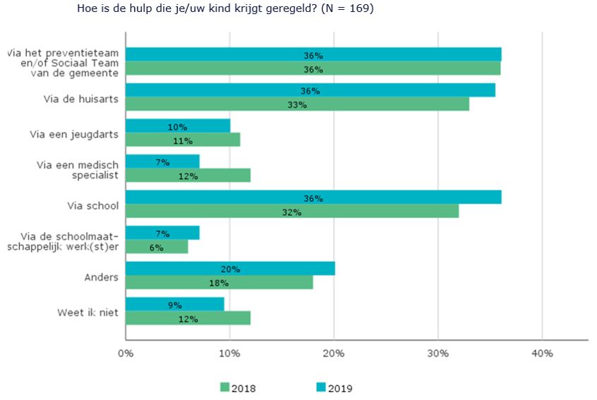 Deze antwoorden komen niet overeen met de eerder gepresenteerde kwantitatieve data over verwijzersaantallen: dit kan komen door de responsecijfers, maar ook door interpretatie van deze vraag door inwoners. Tot slotte zien we in het bovenstaande figuur niet per se de wettelijke verwijzers; het figuur toont vooral aan waar of hoe – in de beleving van de inwoners – de hulp geregeld is. Dan valt vooral ‘via school’ – 36%, op.