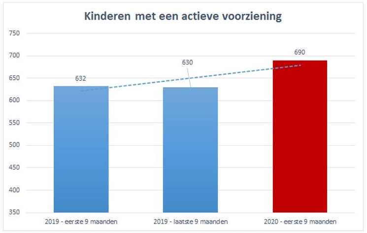 Het aantal kinderen met een Jeugdwetvoorziening kan ook inzicht geven in de kosten en toekomstige kosten voor de jeugdwet. De grafiek hieronder toont het aantal kinderen met een Jeugdwetvoorziening in de eerste negen maanden van 2020, vergeleken met de eerste en laatste negen maanden van 2019; daarbij is voor nu vooral gekeken naar de kinderen van wie al zeker is dat er actief gebruik gemaakt is van de voorziening in 2019 en 2020,d.w.z dat er op de voorziening van deze kinderen reeds gedeclareerd en betaald is.