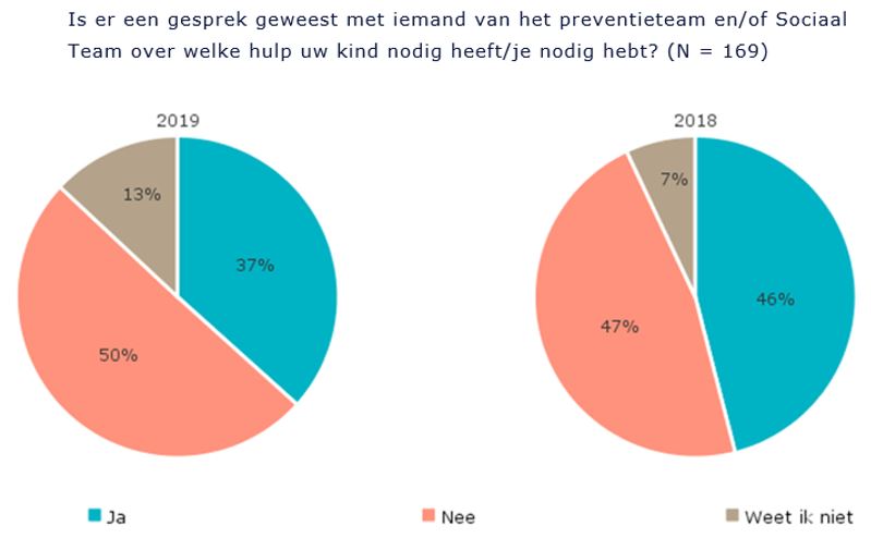 Aan de respondenten die een gesprek hebben gevoerd met het preventieteam en/of sociaal team, is gevraagd naar de tevredenheid over dit gesprek. Het betreft hier een tiental extra vragen op de modellijst. Een sterker onderscheid tussen vragen over het preventieteam en/of sociaal team hebben wij niet aangebracht uit de overweging dat dit de vragenlijst voor kinderen en ouders te onduidelijk zou kunnen maken.