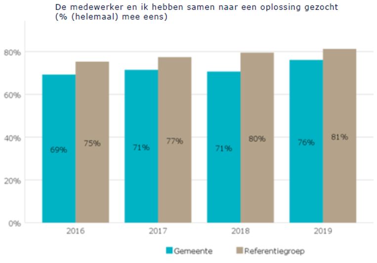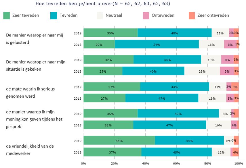 Uit bovenstaande blijkt dat over het algemeen de meerderheid van de respondenten tevreden is over het gesprek met het preventieteam en/of Sociaal Team. Het meest tevreden zijn de respondenten over de vriendelijkheid van de medewerker (90%) en de manier waarop een mening kon worden gegeven tijdens het gesprek (87%). Iets minder tevreden zijn respondenten over de manier waarop er naar de situatie gekeken is. 11% van de respondenten is hier (zeer) ontevreden over. Daarentegen is de meerderheid van de respondenten (76%) hier (zeer) tevreden over. Ten opzichte van 2018 is de tevredenheid op dit punt het meest toegenomen, toen was slechts 65% hier (zeer) tevreden over.