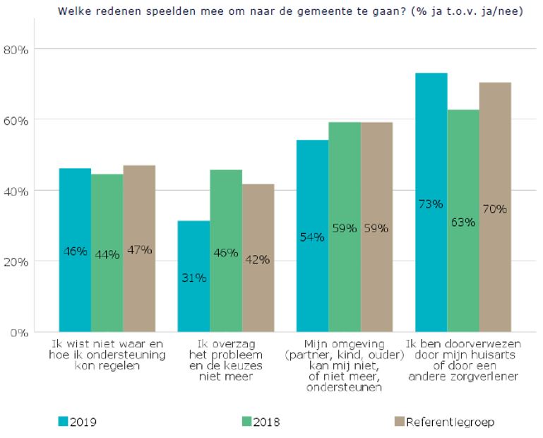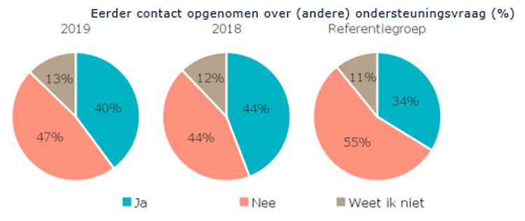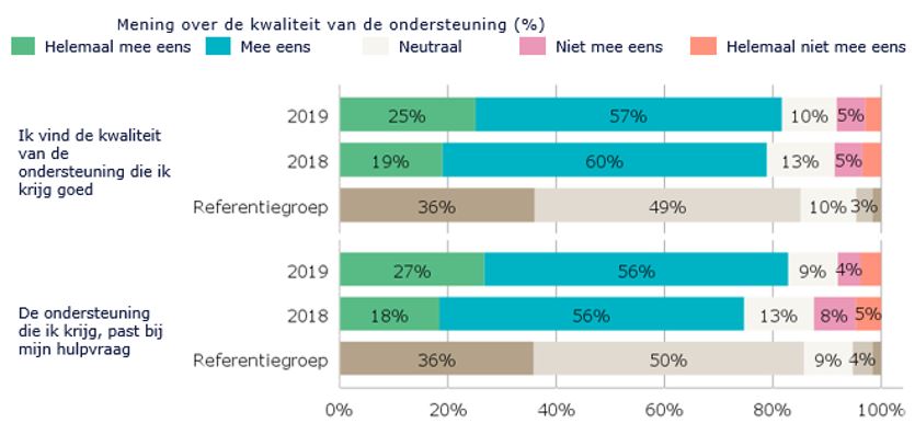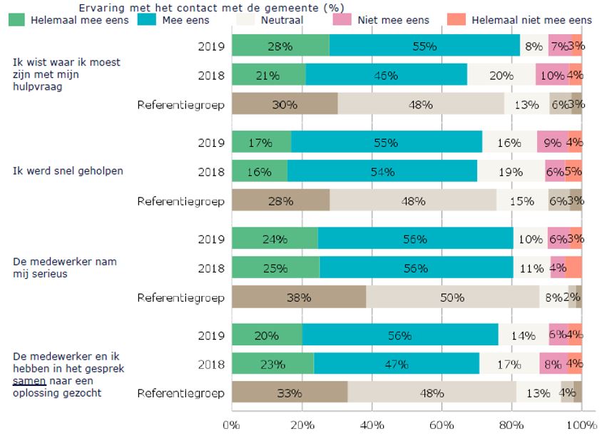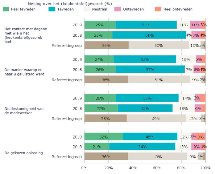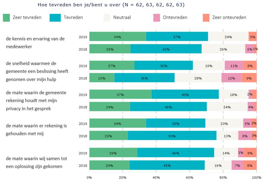 Uit bovenstaande blijkt dat respondenten het minst tevreden zijn over de snelheid waarmee de gemeente een beslissing genomen heeft over de hulp: 62% van de respondenten is hier (zeer) tevreden over. Daarentegen is 19% (zeer) ontevreden over de snelheid waarmee de gemeente een beslissing genomen heeft over de hulp. Ten opzichte van 2018 is de tevredenheid op dit punt al wel gestegen: toen was slechts 51% (zeer) tevreden.