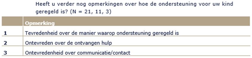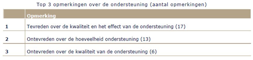 Tot slot is aan de respondenten gevraagd of er verder nog opmerkingen zijn over hoe de ondersteuning geregeld is. In onderstaande tabel is een top 3 van opmerkingen opgenomen.