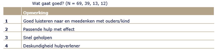 Aan het einde van de modelvragenlijst is ook aan respondenten gevraagd aan te geven wat zij vinden dat op dit moment goed gaat bij de hulp en begeleiding die ze ontvangen. We hebben deze opmerkingen in een top 4 gezet.