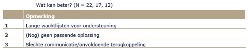 Respondenten is gevraagd aan te geven wat zij vinden dat op dit moment beter kan aan de hulp en begeleiding die ze ontvangen. We hebben deze opmerkingen in een top 3 gezet.