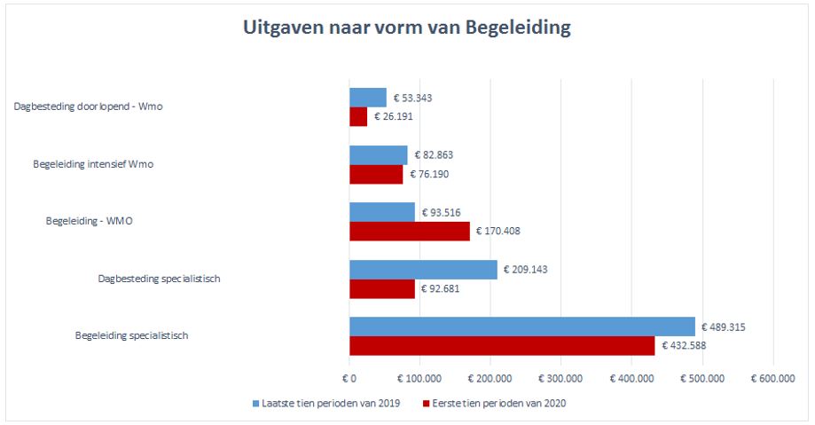 Voor duiding bij de bovenstaande grafiek lijkt het waardevol om een eerdere opmerking te herhalen: op dit moment is het mogelijk dat zorgaanbieders een deel van hun zorgproductie nog moeten declareren bij de gemeente; de afwijkende bedrijfsvoeringsprocessen vanwege corona hebben hier ook nog een effect op. Dit geldt zeker nog voor het derde kwartaal.