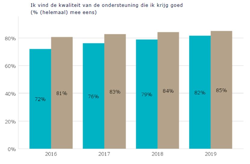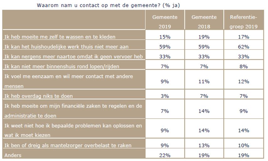 Het cliëntervaringsonderzoek Wmo over 2019 laat over het algemeen geen grote verschuivingen zien, al is de ontwikkeling op veel terreinen positief. Zo wordt zowel het contact met de gemeente als de kwaliteit van de ondersteuning positiever beoordeeld. De kwaliteit van de Wmo-voorzieningen wordt al sinds 2016 ieder jaar iets beter beoordeeld, maar de ervaren kwaliteitsstijging kan daarnaast in 2019 ook deels verklaard worden doordat het aantal inwoners met hulp bij het huishouden relatief gegroeid is in de doelgroep van inwoners met een Wmo-voorziening t.o.v. 2019; de kwaliteit van hulp bij het huishouden wordt gemiddeld bijvoorbeeld hoger beoordeeld dan de ‘rolstoelvoorziening’ of de ‘begeleiding’ voorziening.