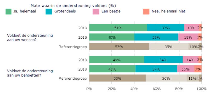 Bovenstaande figuur toont de ervaringen van respondenten met betrekking tot de hulp die zij krijgen bij hun vragen en problemen. 80% van de respondenten vindt dat ze vaak of altijd goed worden geholpen bij hun vragen of problemen. 21% vindt dit niet (altijd). In 2018 lag het percentage dat vond vaak of altijd goed geholpen te worden bij hun vragen en problemen nog een stuk lager: 74%. Het is met deze responsecijfers – en vanwege de anonimiteit van het onderzoek – niet vast te stellen om welke specifieke zorgaanbieders dit in meer of mindere mate gaat.
