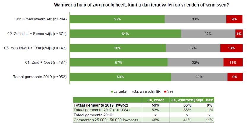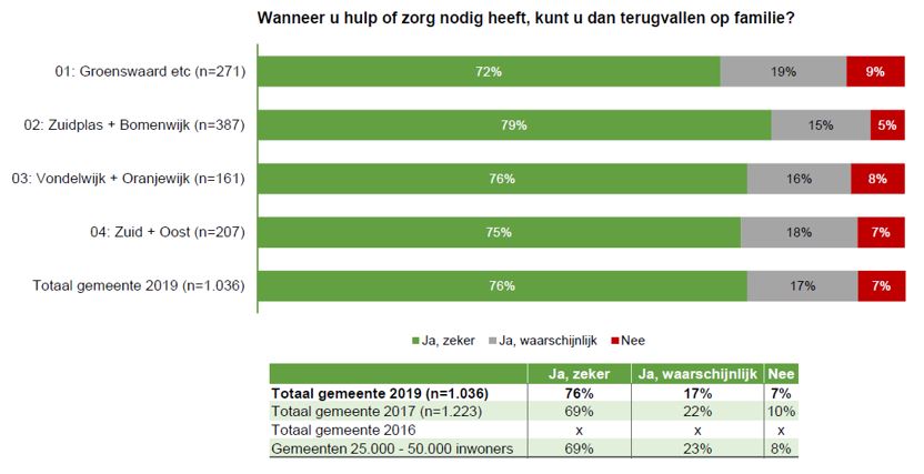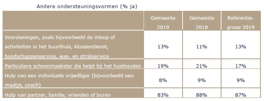 Inwoners gaven in 2019 vaker aan dat zij kunnen terugvallen op hulp uit hun familie dan in 2017; over 2016 zijn er geen gegevens beschikbaar. Dit geldt ook voor het aantal inwoners dat meent te kunnen terugvallen op vrienden of kennissen. Het gaat hierbij om lichte verschuivingen en de verdere nuancering hierbij is dat hulp uit het eigen netwerk veelal aanvullend en niet vervangend voor professionele hulpverlening is.