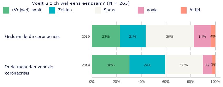Wij hebben – hoewel de coronacrisis niet in 2019 plaatsvond – ook besloten om vragen toe te voegen over de effecten van Covid-19 op de zorg en ondersteuning die op grond van de Wmo aan de inwoners geboden wordt. De vragenlijsten zijn rond mei en juni dit jaar naar de inwoners gegaan en dit was dus vooral aan het begin van de coronacrisis. Het onderzoek toont aan dat de inwoners met een Wmo-voorziening hun (ervaren) gezondheid minder positief beoordelen en dat zij eenzamer zijn geworden: zo gaf 41% aan soms of vaker eenzaam te zijn voor de coronacrisis; tijdens de crisis – en d.w.z. in dit geval dus maart tot en met mei van 2020 – was dit 57% van de ondervraagden.