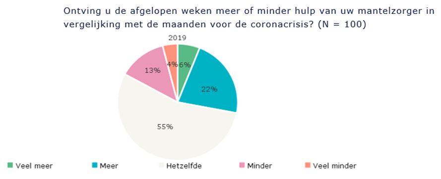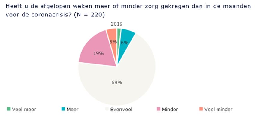 De meeste respondenten (69%) geven aan in de afgelopen weken evenveel zorg te hebben gekregen dan in de maanden voor de coronacrisis. Voor 7% geldt dat men (veel) meer zorg ontving. 24% ontving (veel) minder zorg dan in de maanden voor de coronacrisis.