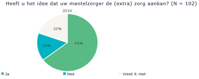 Vervolgens is gevraagd of men het idee heeft dat de mantelzorger de (extra) hulp aankan. 65% antwoordt hierop met ‘ja’, 16% antwoordt ‘nee’, 20% weet het niet. Opvallend is dat het percentage dat hier ‘ja’ op antwoordt lager uitvalt wanneer er gerefereerd wordt aan de coronacrisis. Toen dit eerder nog niet het geval was, antwoordde 70% op deze zelfde vraag nog met ‘ja’.