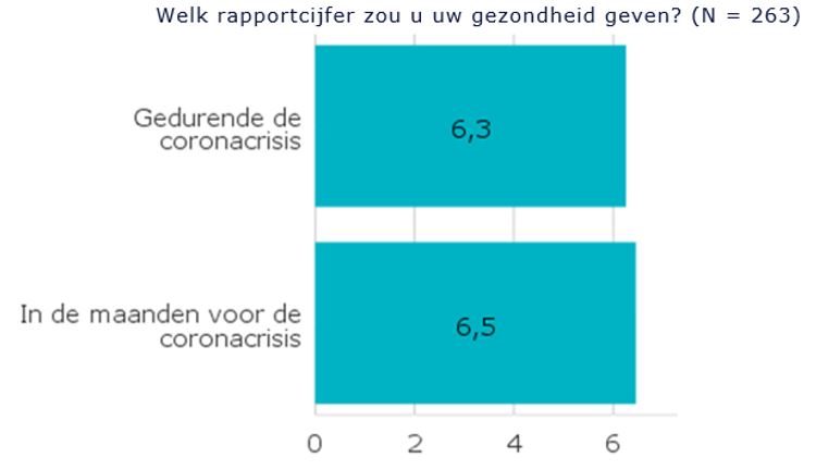 De beoordeling voor de gezondheid gedurende de coronacrisis komt uit op een 6,3. Dat is 2 procentpunt lager dan het cijfer dat men aan de gezondheid gaf in de maanden voor de coronacrisis: 6,5.