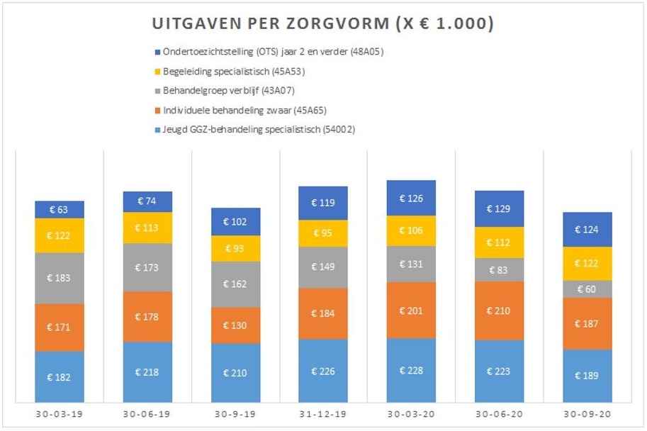 In een drietal grafieken laten wij een aantal ontwikkelingen zien binnen een aantal van de vormen van zorg en ondersteuning die vanaf 2019 aan kinderen geleverd is. Het gaat hierbij om een twintigtal van de ‘meeste gebruikte’ of in dit geval de duurste vormen van ondersteuning, bezien vanaf 1 januari 2019.