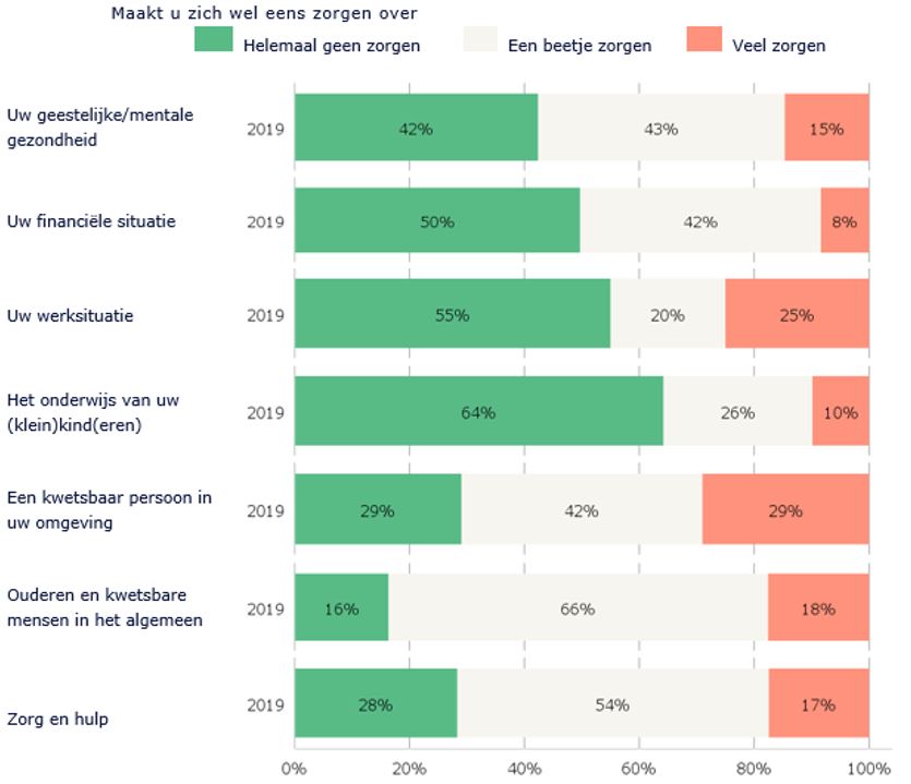 Respondenten geven aan zich het meest zorgen te maken over een kwetsbaar persoon in hun omgeving (29% veel zorgen) en de eigen werksituatie (25% veel zorgen). De minste respondenten maken zich zorgen om het onderwijs van de (klein)kinderen. 64% geeft aan zich hier helemaal geen zorgen over te maken, 26% maakt zich een beetje zorgen en 10% maakt zich veel zorgen. Onderwerpen waarover veel respondenten zich een beetje zorgen maken zijn ouderen en kwetsbaren in het algemeen (66%) en zorg en hulp (54%).