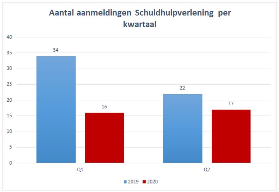 In het eerste half jaar van 2020 is het aantal aanmeldingen voor schuldhulpverlening gedaald ten opzichte van het aantal aanmeldingen in 2019. Met name in het eerste kwartaal van 2020 was het aantal aanmeldingen aanzienlijk (meer dan 50%) lager. Deze daling is in lijn met de landelijke trend, die waarschijnlijk wordt veroorzaakt door de corona uitbraak. De verwachting is dat deze tijdelijke daling van het aantal aanmeldingen zal leiden tot een hoger aantal aanmeldingen in 2021.