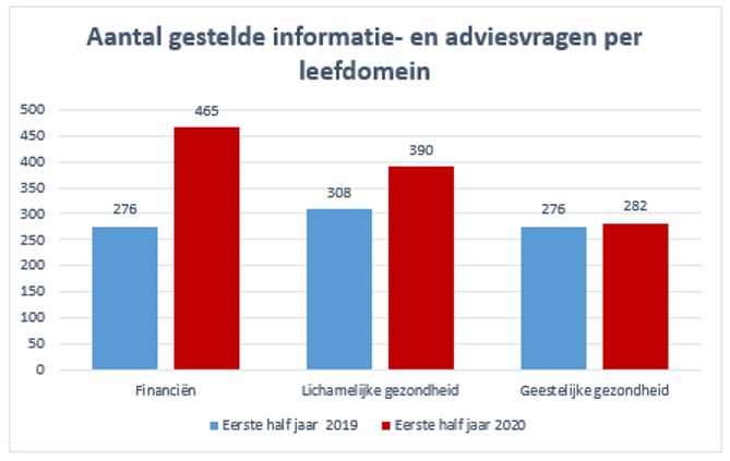 Zoals te zien in de onderstaande figuur, is in de eerste helft van 2020 op de leefdomeinen financiën en lichamelijke gezondheid een stijging in het aantal ontvangen informatie- en adviesvragen te zien die sterker is dan de algemene stijging van het aantal ontvangen informatie- en adviesvragen.
