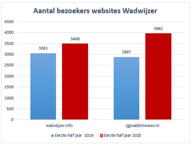 Beide websites hebben in de eerste helft van 2020 wederom een stijging in het aantal bezoeken laten zien, zoals ook te zien is in de onderstaande tabel. Het aantal bezoeken van wadwijzer.info steeg met 14.2% naar 3498 bezoekers. Het aantal bezoekers van de cjg website steeg met 21% naar 3962 bezoeken in het eerste half jaar.