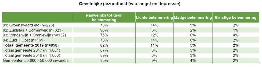 In 2016 ervaarde 89% van de inwoners nauwelijks tot geen belemmering; in 2019 was dit 82%. In deze verschuiving nam vooral het aantal mensen dat een lichte belemmering ervaren om aan het maatschappelijk leven deel te nemen vanwege hun geestelijke gezondheid toe. De nuancering is dan ook dat 93% van de inwoners een lichte tot nauwelijks belemmering ervaarde, waar dit in 2016 nog 95% was.