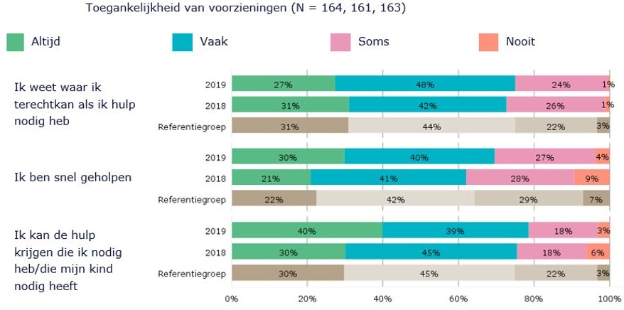Jongeren en ouders is gevraagd naar de toegankelijkheid van de voorzieningen. 75% van de respondenten weet vaak of altijd waar ze terechtkunnen als er hulp nodig is. Ten opzichte van 2018 is dit percentage licht gestegen (toen was het 73%). Ouders weten doorgaans beter waar zij terechtkunnen voor hulp dan jongeren.