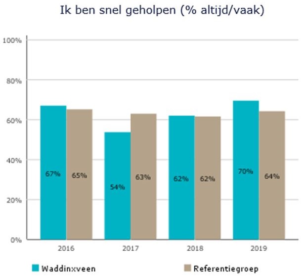 In de gemeente Waddinxveen vindt 70% van de respondenten dat zij snel geholpen zijn. 31% vindt dat zij soms of nooit snel geholpen zijn. In 2018 lag het percentage dat aangaf snel geholpen te zijn nog een stuk lager met 62%. Daarmee zet de eerder ingezette stijging op dit vlak verder door (in 2017 was het nog 54%).