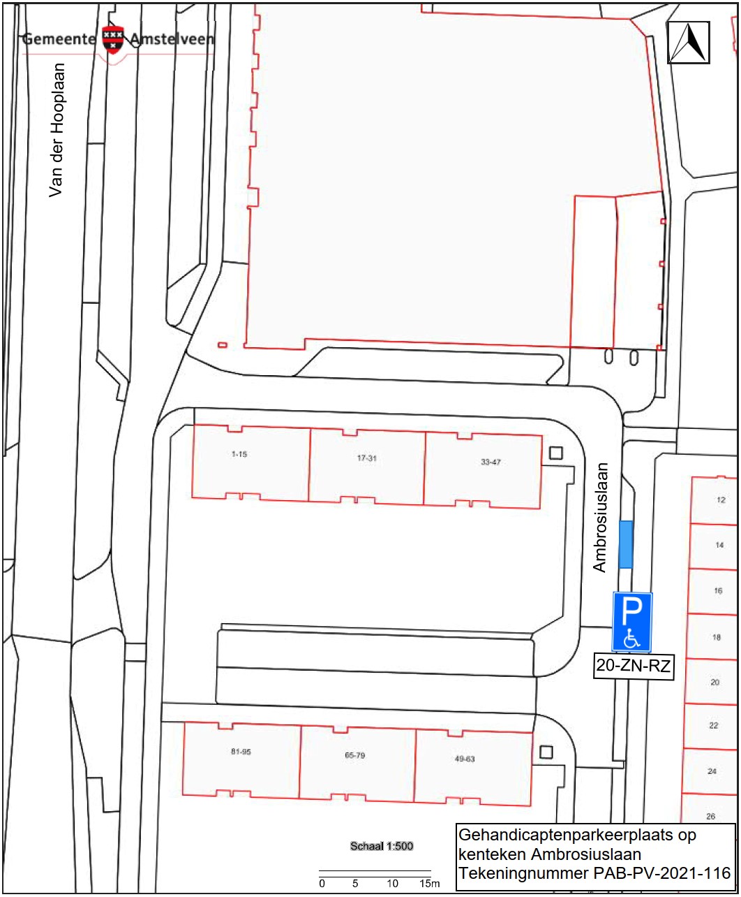 Burgemeester en wethouders van Amstelveen besluiten het parkeren te verbieden op een parkeerplaats in de Ambrosiuslaan, zoals aangegeven op tekening PAB-PV-2021-116, met uitzondering van het voertuig met het kenteken 20-ZN-RZ (gehandicaptenparkeerplaats).