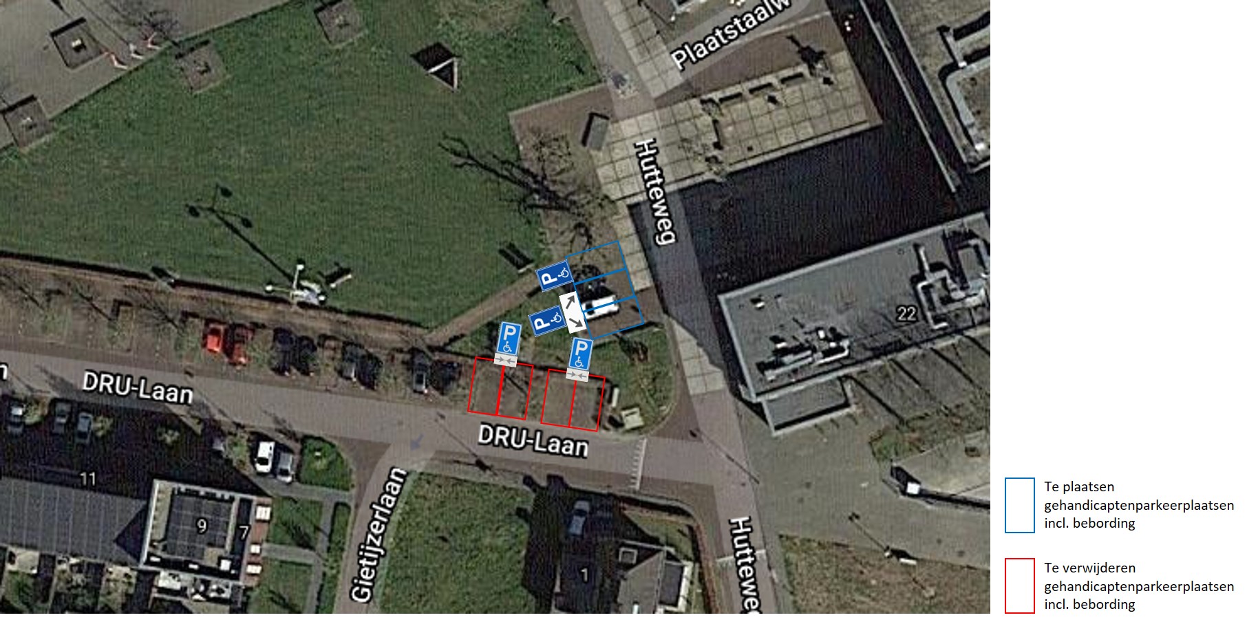 Door het verwijderen van de vier huidige gehandicaptenparkeerplaatsen (t.h.v. DRU-Laan 3) en het situeren van 3 nieuwe gehandicaptenparkeerplaatsen tegenover de hoofdingang van de DRU (Hutteweg 24) in Ulft is de loopafstand korter en is er geen sprake van een helling.