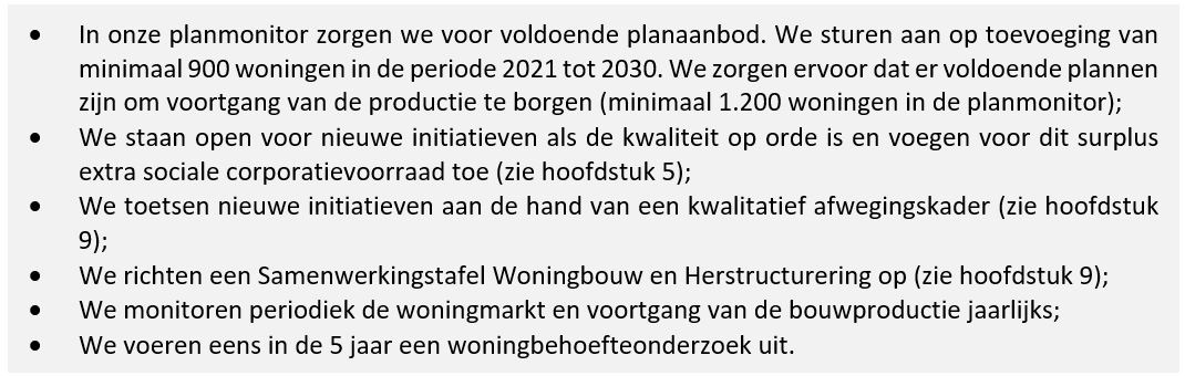 De woningmarkt is veranderlijk. Dat zal ook in de komende jaren blijven. Daarom is het van belang goed zicht te blijven houden op de ontwikkelingen op de woningmarkt, de voortgang van de woningbouwproductie en herstructurering. Dat doen we jaarlijks. Ook vinden wij het belangrijk om periodiek de actuele woonwensen bij onze inwoners te peilen. Dat doen we één keer per 5 jaar, gekoppeld aan het opstellen van een nieuwe Woonvisie.