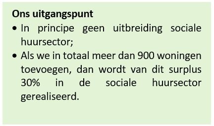 In de praktijk zien we een grotere druk op de sociale huursector, en voorzien we ook voor de toekomst voldoende behoefte aan met name kwalitatief goede, levensloop-geschikte woningen voor kleine huishoudens. Als we meer dan 900 woningen toevoegen, dan zal de voorraad sociale huurwoningen wel in redelijke verhouding moeten toene-men (30%), met name met het oog op de grote druk op de woningmarkt en regionale afspraken.
