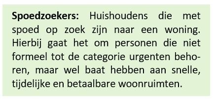 Wat betreft spoedzoekers zien we doorgaans een urgente vraag onder mensen die om verschillende redenen met spoed woonruimte nodig hebben, en niet in aanmerking komen voor een reguliere urgentieverklaring (bijvoorbeeld in verband met ander werk, relatieverbreking, e.d.). De omvang ervan is nog lastig te duiden, dat zullen we in het vervolgproces proberen scherp te krijgen, inclusief eventuele maatregelen die hiervoor nodig zijn;
