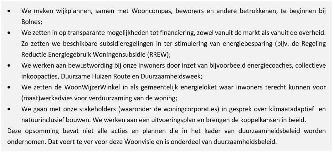 Voorts zal er een mix van instrumenten ingezet moeten worden (waaronder simulatiespel, gemeentelijke en landelijke subsidies/leningen, gemeentelijke VerduurzamingsRegeling, wijkacties via subsidie Regeling Reductie Energiegebruik Woningensubsidie (RREW), bewustwordingscampagnes, inzet WoonWijzer-Winkel). Tot slot ligt er een kans om de opgave op het gebied van energie te combineren met klimaatadaptatie (bestendige, groene woonomgeving).