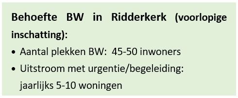 Beschermd Wonen & Maatschappelijke Opvang (BW-MO): vanaf 2021 start de verdere decentralisatie BW. De gemeente wil in dit traject inhoudelijke verbeteringen bereiken en een beweging van beschermd wonen naar een beschermd thuis in de wijk realiseren. De omvang van deze opgave moet nog duidelijk worden en vertaald worden naar de wijken van Ridderkerk. Dat krijgt een plek in de Woonvisie.