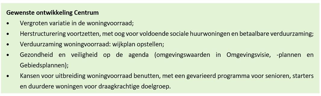 Woningbouw in het centrum biedt kansen: het Ontwikkelperspectief Centrum 2035 geeft dat duidelijk aan. Met meer woningen kan het centrum meer gebruiks- en belevingswaarde krijgen. Het toevoegen van woningen kan op de verdiepingen van gebouwen of doorwinkelruimtes in de aanloopstraten te transformeren naar wonen. Met meer bewoners komen er ook meer (potentiële) bezoekers voor winkels in het centrum. Dat maakt het centrum levendiger en daardoor ook (sociaal) veiliger. Het Wijkoverleg stelt dat er kansen liggen voor het huisvesten van senioren en starters. Daarnaast biedt het bouwen van middeldure en dure huur- en koopwoningen kansen om een draagkrachtige doelgroep te huisvesten. Dit draagt bij aan de financiële draagkracht van het centrum en de winkels.