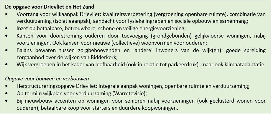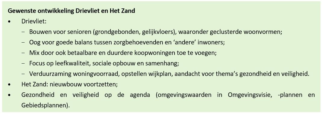 De wijk verandert: de wijk verjongt (vooral door nieuwbouw in Het Zand), maar tegelijkertijd neemt ook het aantal sociaal-economisch zwakkere huishoudens toe. Dit vergroot de verschillen tussen buurten binnen de wijk. Grondgebonden gelijkvloerse woningen met een tuin kunnen de doorstroom van ouderen helpen. Het Zand is al deels zonder aardgas. Voor Drievliet ligt er een grote opgave om bestaande woningen te isoleren en van het gas af te halen.