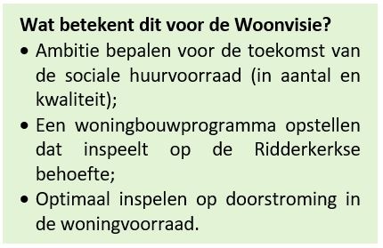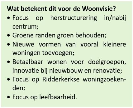Belangrijk uitgangspunt is vooralsnog het Regioakkoord nieuwe Woningmarktafspraken Regio Rotterdam voor de periode 2018-2030. In dit akkoord maken de veertien gemeenten van het Samenwerkingsverband Wonen zich samen sterk om het aantal woningen in de regio Rotterdam met 54.000 uit te breiden. De gemeenten en de woningcorporaties zetten zich ook in voor een betere balans van het woningaanbod in de regio. Voor de gemeente Ridderkerk is het akkoord gebaseerd op de bieding die destijds door de gemeente zelf is gedaan. Deze komt neer op een opgave van 830 woningen in de periode tot 2030 (gerekend vanaf 2017).