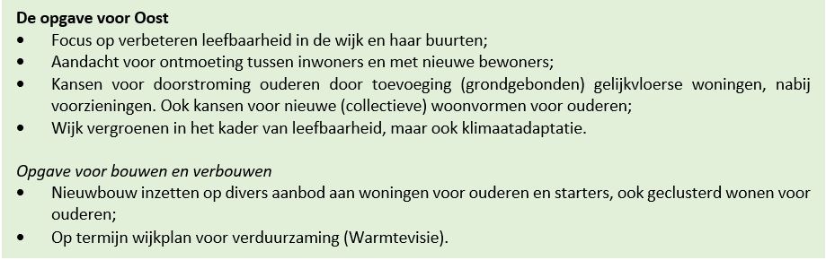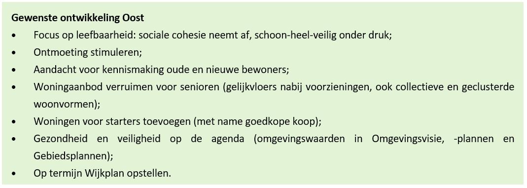 Ook Oost verandert door de wijzigende samenstelling van de bevolking. De leefbaarheid verdient aandacht, samen met bewoners: sociale cohesie neemt wat af, schoon-heel-veilig staat onder druk. In de toekomst zal de wijk verder vergrijzen. Eenzaamheid onder ouderen is komende jaren punt van aandacht. In het Wijkprogramma voor Oost wordt op verschillende onderwerpen ingezet, waarvan een deel betrekking heeft op ‘wonen’. In Oost moet ontmoeting tussen verschillende groepen (jong en oud) sterker gestimuleerd worden. Ook is specifiek aandacht nodig voor kennismaking met nieuwe bewoners. Het aanbod van woonruimte voor senioren is niet afgestemd op de vraag. In de buurten van Oost is voorts aandacht nodig voor verduurzaming en klimaatadaptatie (met name aandacht vergroening, vooral bij particulieren).